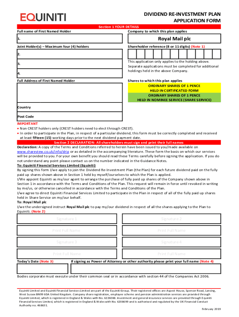 DIVIDEND REINVESTMENT PLAN APPLICATION FORM Full name of First Named HolderSection 1 YOUR DETAILS Company to which this plan applies Royal Mail plc1. Joint Holder(s) Maximum four (4) holdersShareholder