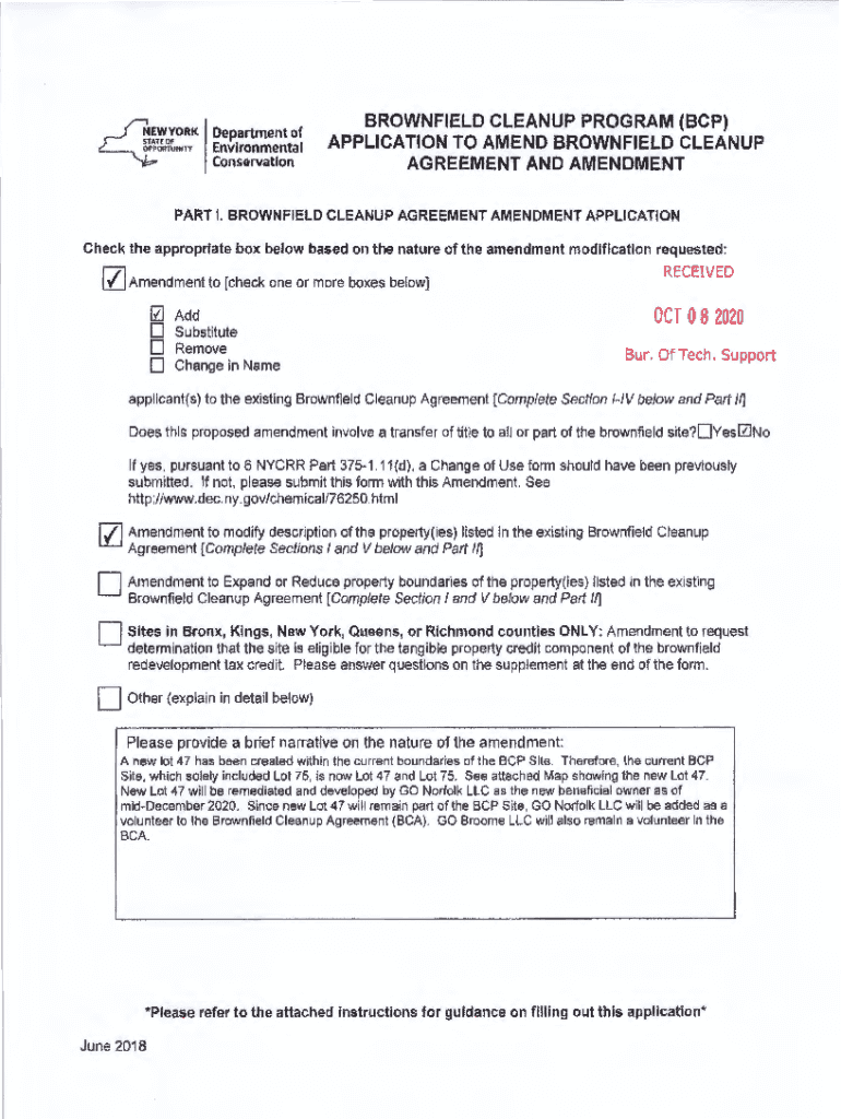 Department of Environmental ConservationBROWNFIELD CLEANUP PROGRAM (BCP) APPLICATION TO AMEND BROWNFIELD CLEANUP AGREEMENT AND AMENDMENTPART I. BROWNFIELD CLEANUP AGREEMENT AMENDMENT APPLICATIONCheck