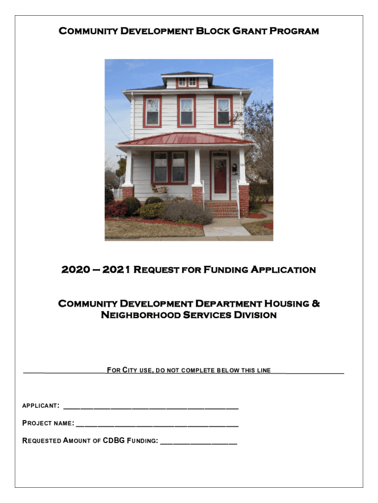 COMMUNITY DEVELOPMENT BLOCK GRANT PROGRAM2020 2021 REQUEST FOR FUNDING APPLICATION COMMUNITY DEVELOPMENT DEPARTMENT HOUSING & NEIGHBORHOOD SERVICES DIVISION CITY USE, DO NOT COMPLETE BELOW THIS LINEAPPLICANT