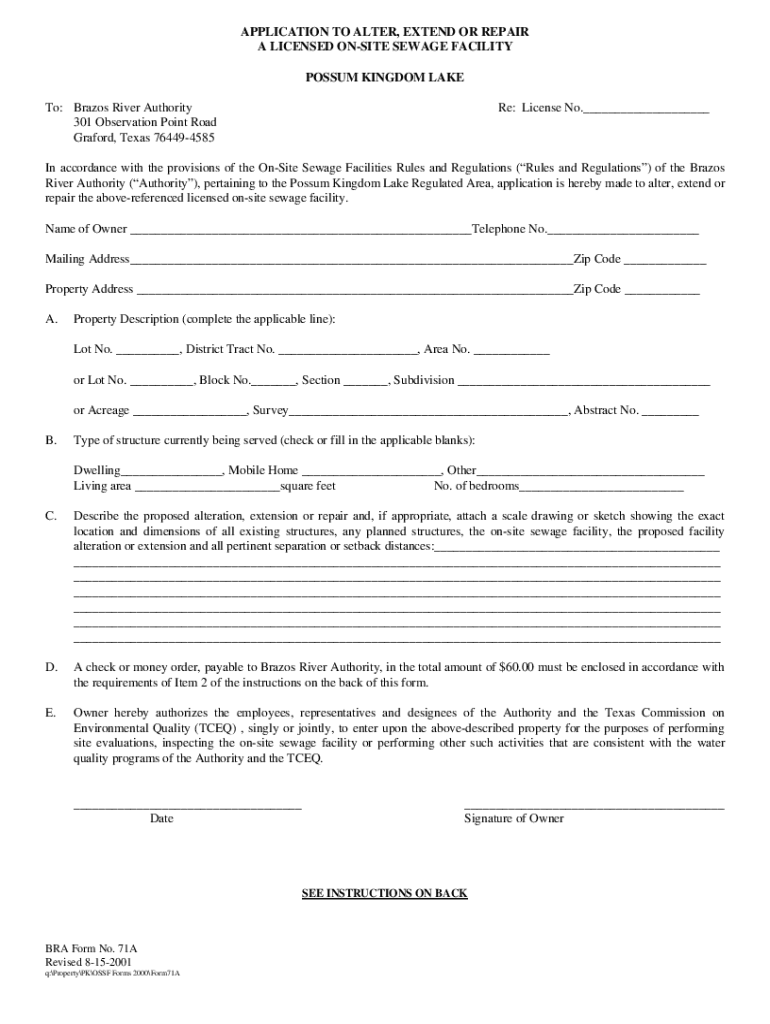 APPLICATION TO ALTER, EXTEND OR REPAIR A LICENSED ONSITE SEWAGE FACILITY POSSUM KINGDOM LAKE To: Brazos River Authority 301 Observation Point Road Bradford, Texas 764494585Re: License No. In accordance