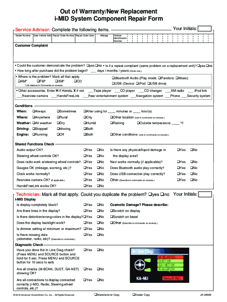 Out of Warranty/New Replacement mid-System Component Repair Form Your Initials:Service Advisor: Complete the following items. Dealer Numerate Vehicle Sold Repair Order Number Repair Order DateMileageVehicle