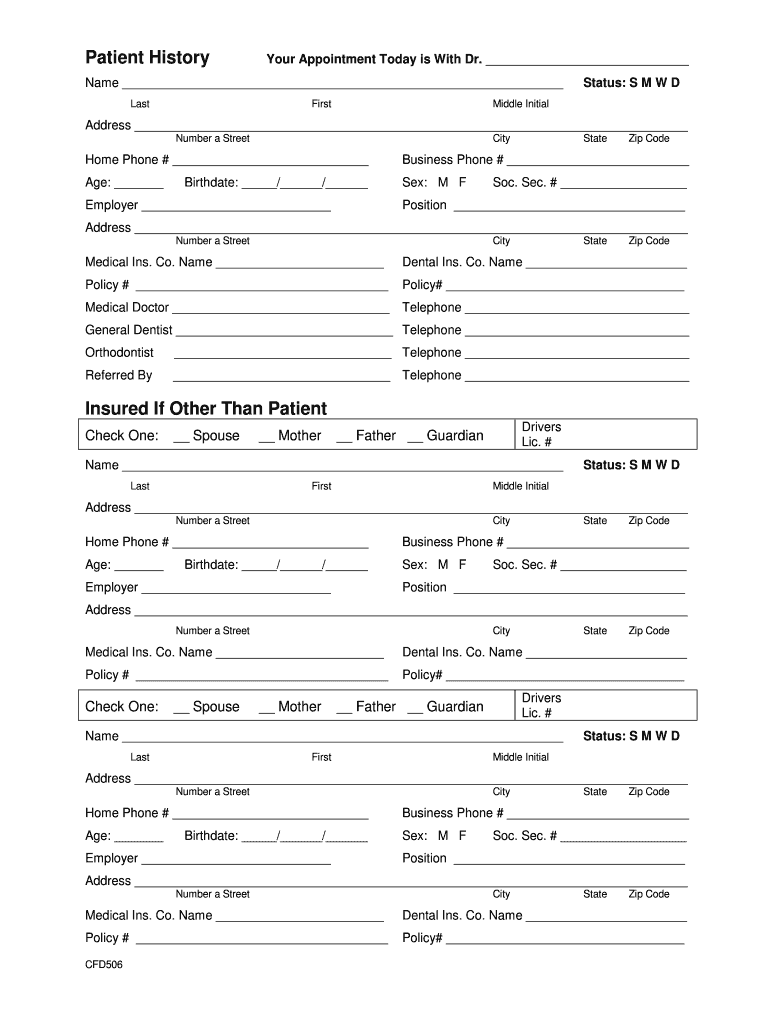 Individuals required to complete the patient history form typically include the patient, their guardians, and other authorized persons. Specific roles include: