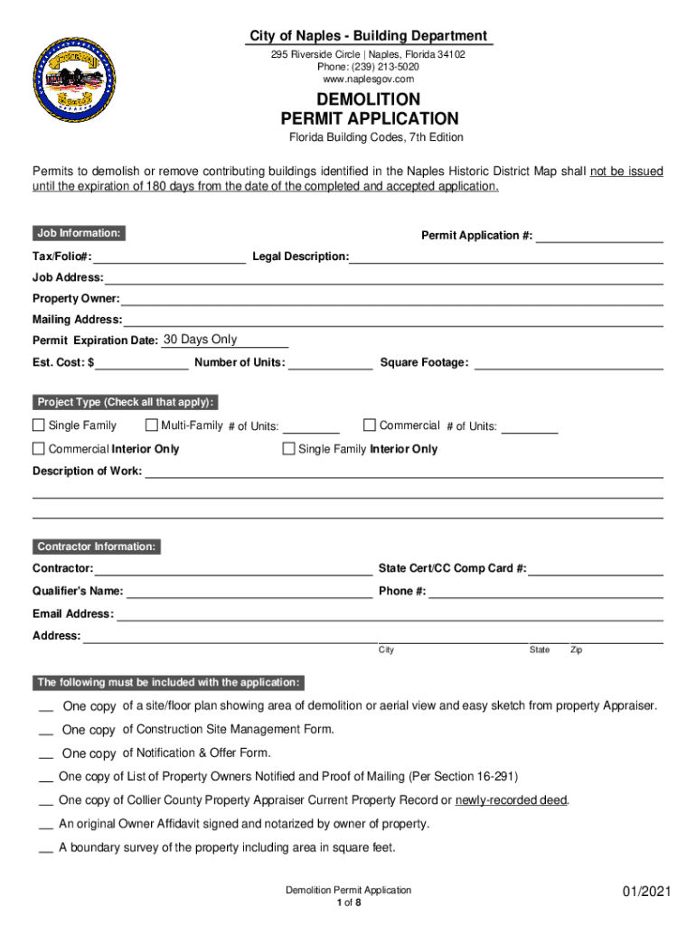 City of Naples Building Department 295 Riverside Circle Naples, Florida 34102 Phone: (239) 2135020 www.naplesgov.comDEMOLITION PERMIT APPLICATION Florida Building Codes, 7th EditionPermits to demolish