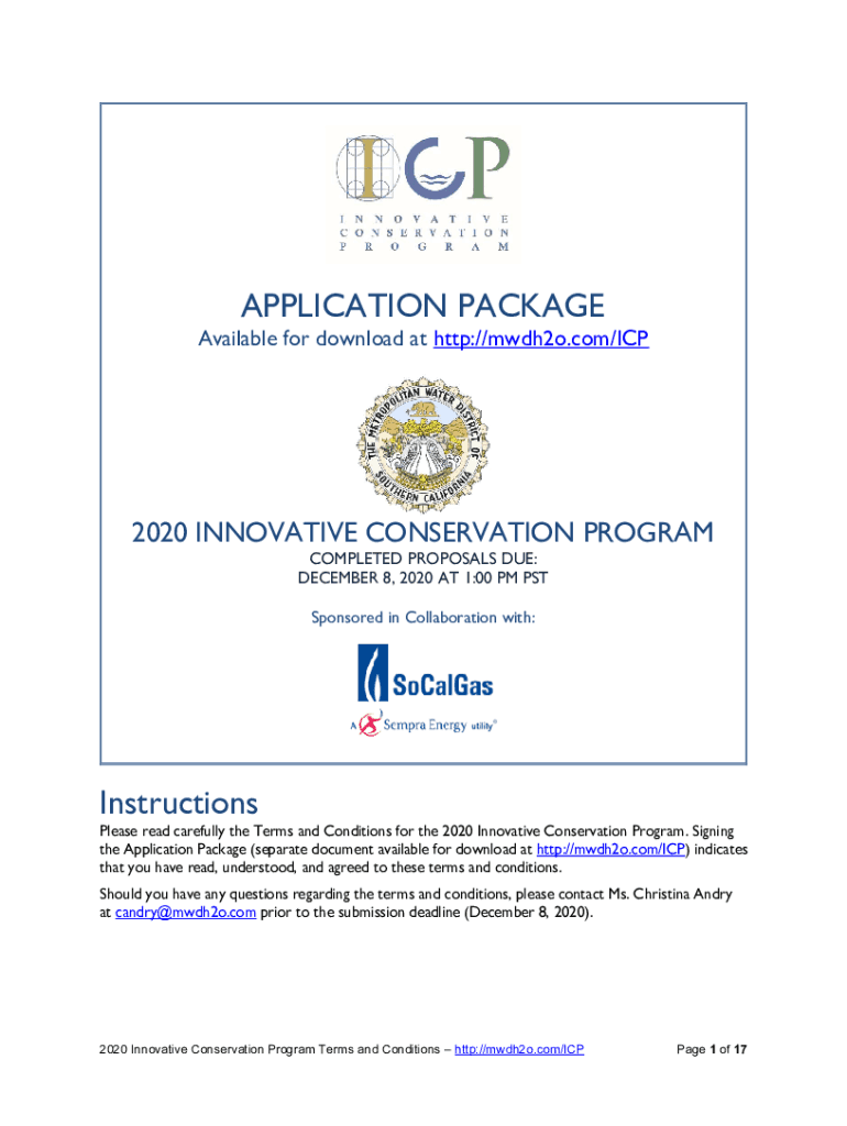 APPLICATION PACKAGE Available for download at http://mwdh2o.com/ICP2020 INNOVATIVE CONSERVATION PROGRAM COMPLETED PROPOSALS DUE: DECEMBER 8, 2020, AT 1:00 PM PST Sponsored in Collaboration with:InstructionsPlease