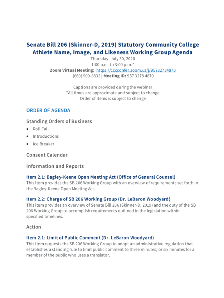 Senate Bill 206 (Skinner, 2019) Statutory Community College Athlete Name, Image, and Likeness Working Group Agenda Thursday, July 30, 2020 1:00 p.m. to 3:00 p.m.* Zoom Virtual Meeting: https://cccconfer.zoom.us/j/95732784870