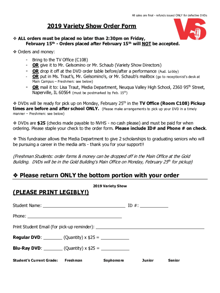All sales are final refunds issued ONLY for defective DVDs2019 Variety Show Order Form ALL orders must be placed no later than 2:30pm on Friday, February 15th Orders placed after February 15th will