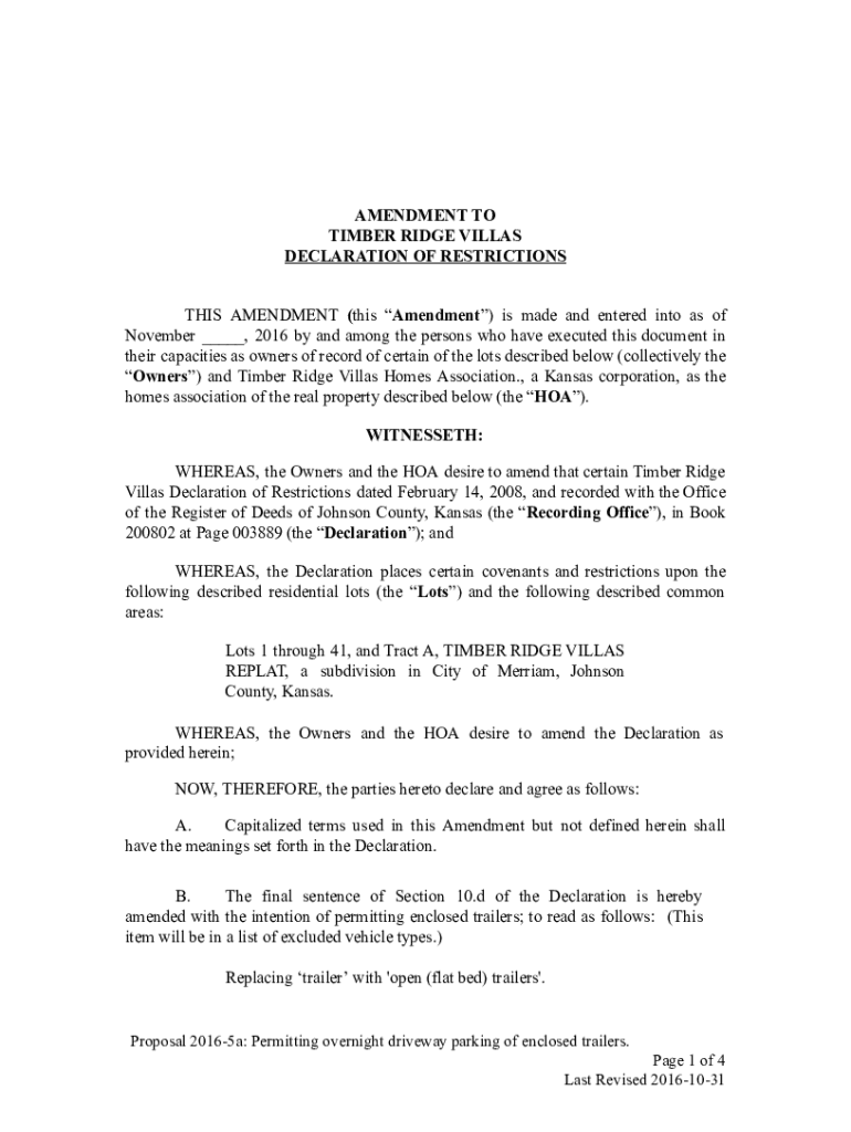 AMENDMENT TO TIMBERRIDGEVILLAS DECLARATIONOFRESTRICTIONS THIS AMENDMENT (this A amendment) is made and entered into as of November 2016 by and among the persons who have executed this document in