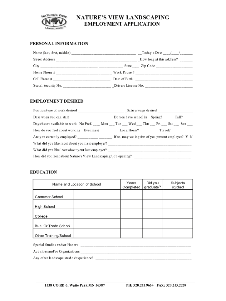 NATURES VIEW LANDSCAPING EMPLOYMENT APPLICATIONPERSONAL INFORMATION Name (last, first, middle) Today's Date / / Street Address How long at this address? City State Zip Code Home Phone # Work Phone