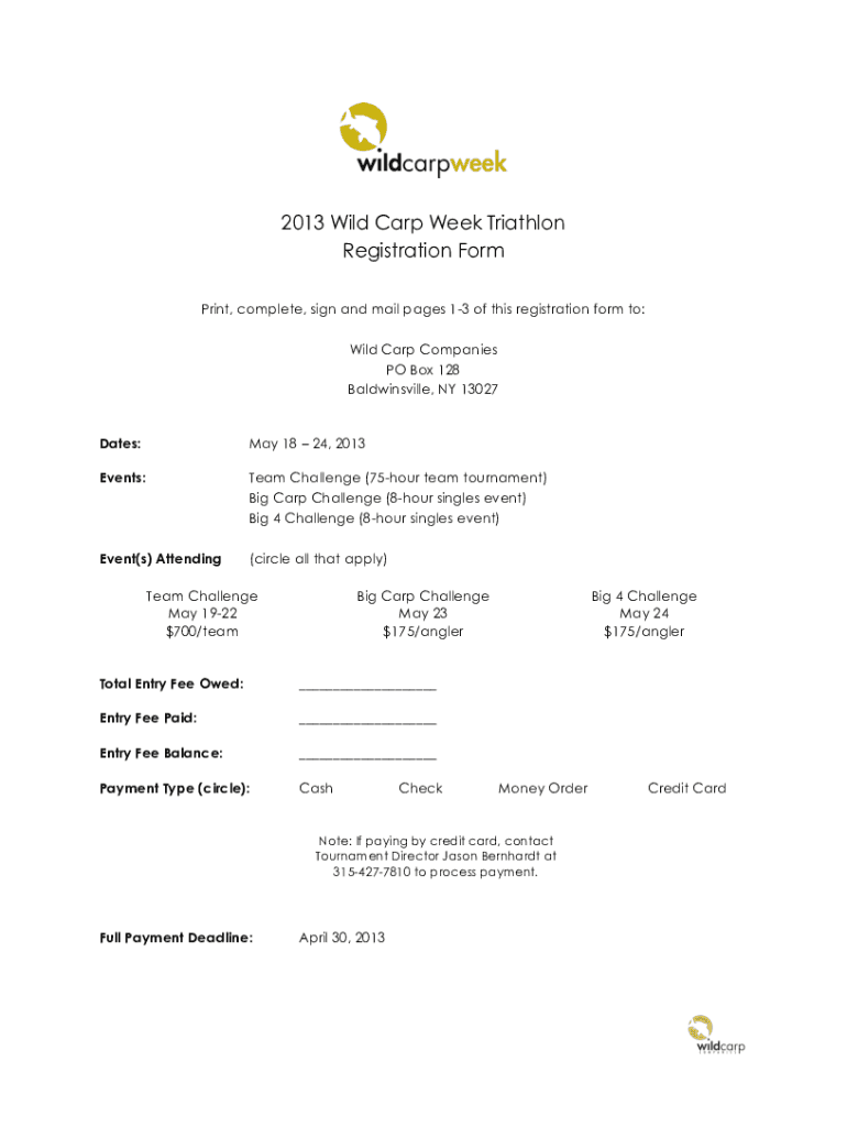 2013 Wild Carp Week Triathlon Registration Form Print, complete, sign and mail pages 13 of this registration form to: Wild Carp Companies PO Box 128 Baldwinsville, NY 13027Dates:May 18 24, 2013Events:Team