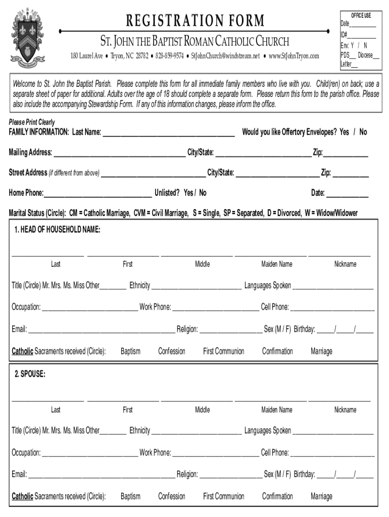 REGISTRATION FORMOFFICE USES. JOHN THE BAPTIST ROMAN CATHOLIC CHURCH 180 Laurel Ave Bryon, NC 28782 8288599574 StJohnChurch wind stream.net www.StJohnTryon.comDate ID# Env: Y / N PDS Diocese Letter