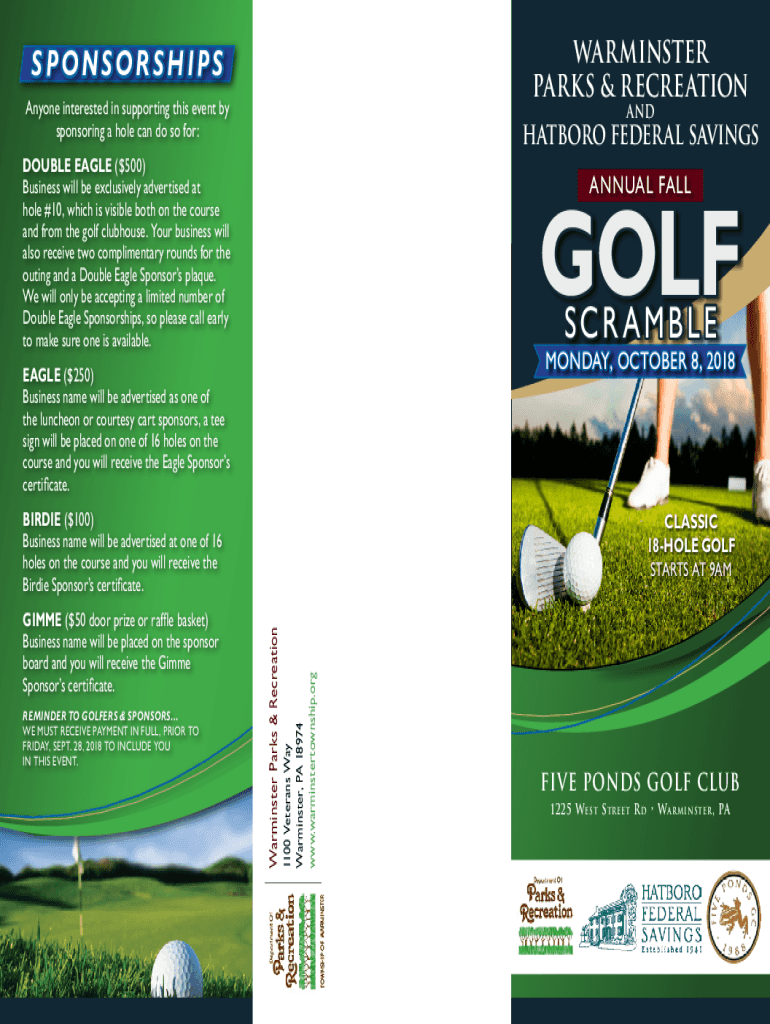 WESTMINSTER PARKS & RECREATIONSPONSORSHIPS Anyone interested in supporting this event by sponsoring a hole can do so for:ANDHATBORO FEDERAL SAVINGSDouble Eagle ($500) Business will be exclusively