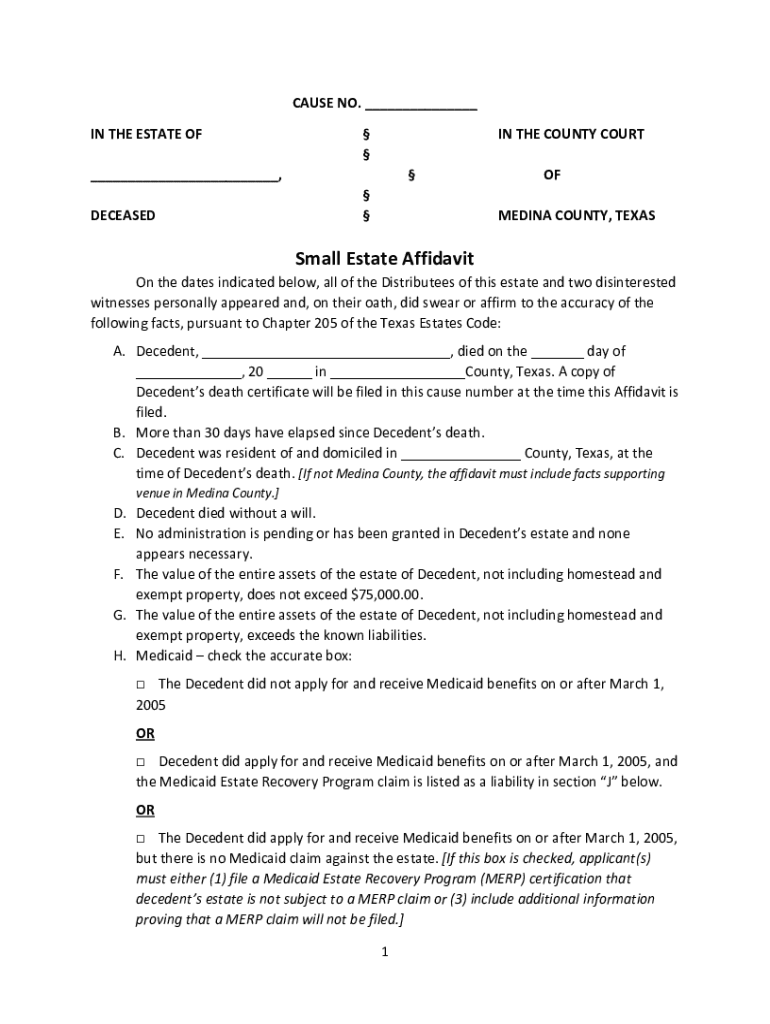 CAUSE NO. IN THE ESTATE OF, DECEASED IN THE COUNTY COURT OF MEDINA COUNTY, TEXASSmall Estate Affidavit the dates indicated below, all the Distributes of this estate and two disinterested witnesses