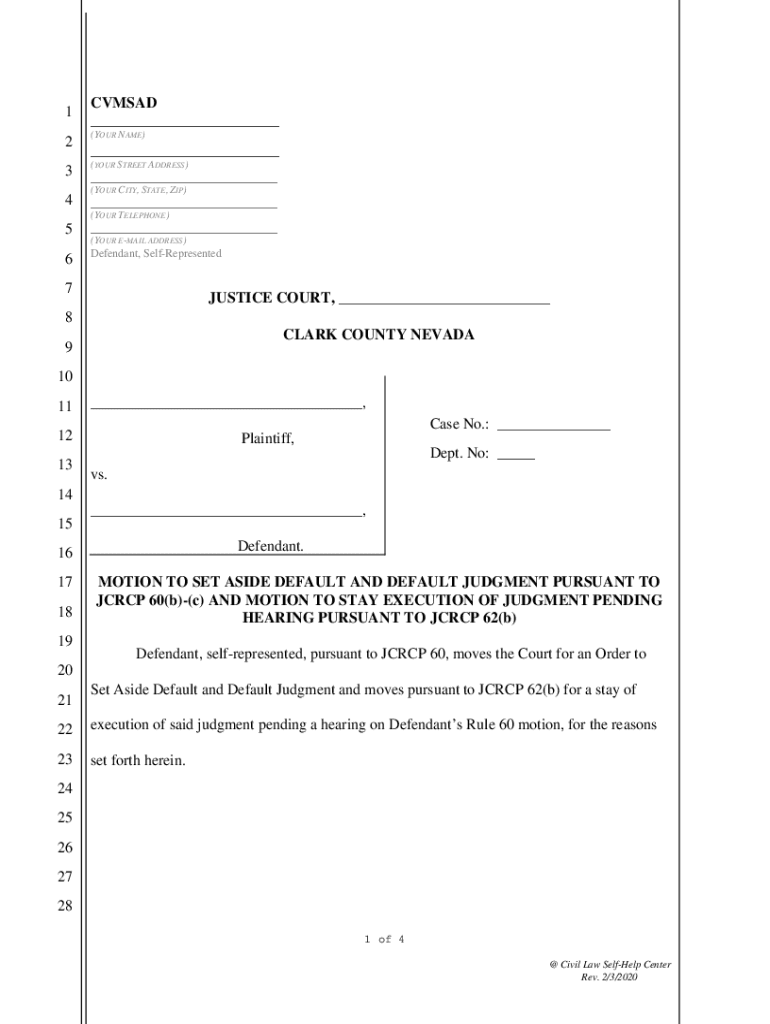 1CVMSAD 2(YOUR NAME)3(YOUR STREET ADDRESS)4 (YOUR CITY, STATE, ZIP) (YOUR TELEPHONE)5 6 (YOUR EMAIL ADDRESS)Defendant, SelfRepresented7JUSTICE COURT, 8 CLARK COUNTY NEVADA9 10 11, Case No.: 12 13Plaintiff,