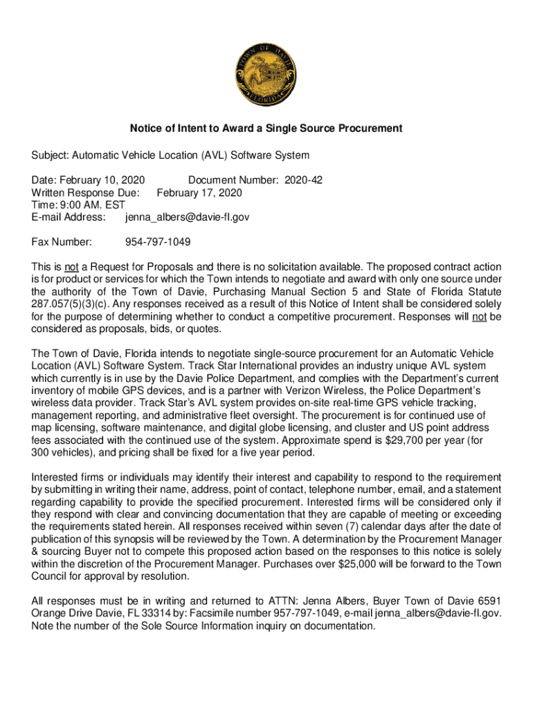 Get the free Notice of Intent to Award a Single Source Procurement Subject ...