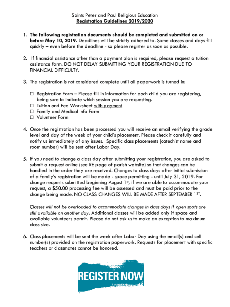 Saints Peter and Paul Religious Education Registration Guidelines 2019/2020 1. The following registration documents should be completed and submitted on or before May 10, 2019. Deadlines will be strictly
