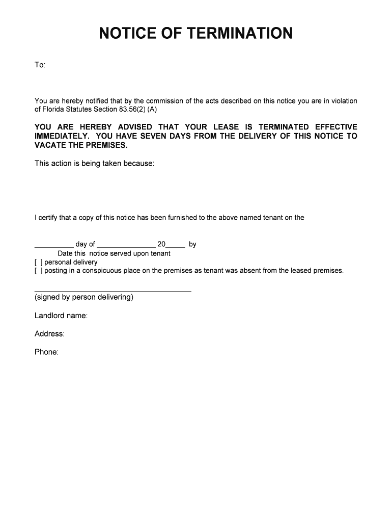 NOTICE OF TERMINATION To: You are hereby notified that by the commission of the acts described on this notice you are in violation of Florida Statutes Section 83.56(2) (A) YOU ARE HEREBY ADVISED THAT