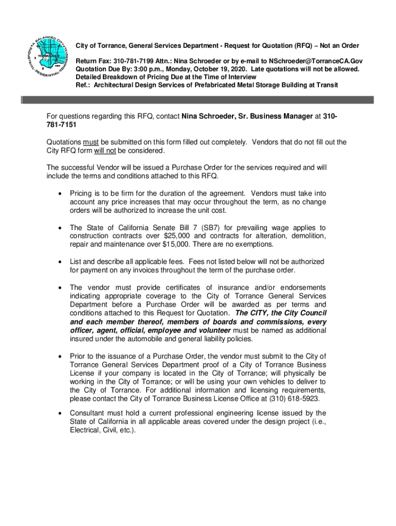 City of Torrance, General Services Department Request for Quotation (RFQ) Not an Order Return Fax: 3107817199 Attn.: Nina Schroeder or by email to Schroeder Torrance CA. Gov Quotation Due By: 3:00