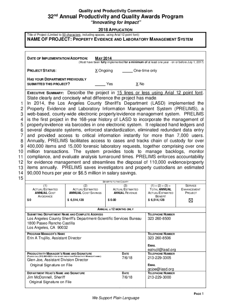 Quality and Productivity Commission nd32Annual Productivity and Quality Awards Program Innovating for Impact 2018 APPLICATIONTitle of Project (Limited to 50 characters, including spaces, using Arial