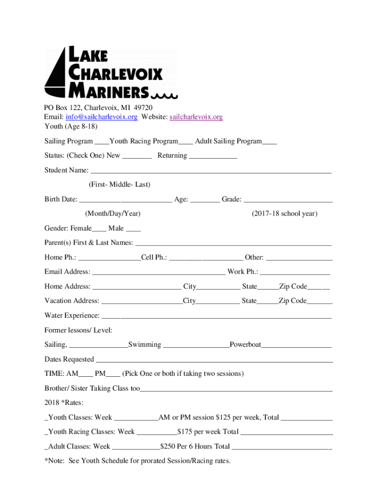 PO Box 122, Charleroi, MI 49720 Email: info sailcharlevoix.org Website: sailcharlevoix.org Youth (Age 818) Sailing Program Youth Racing Program Adult Sailing Program Status: (Check One) New Returning