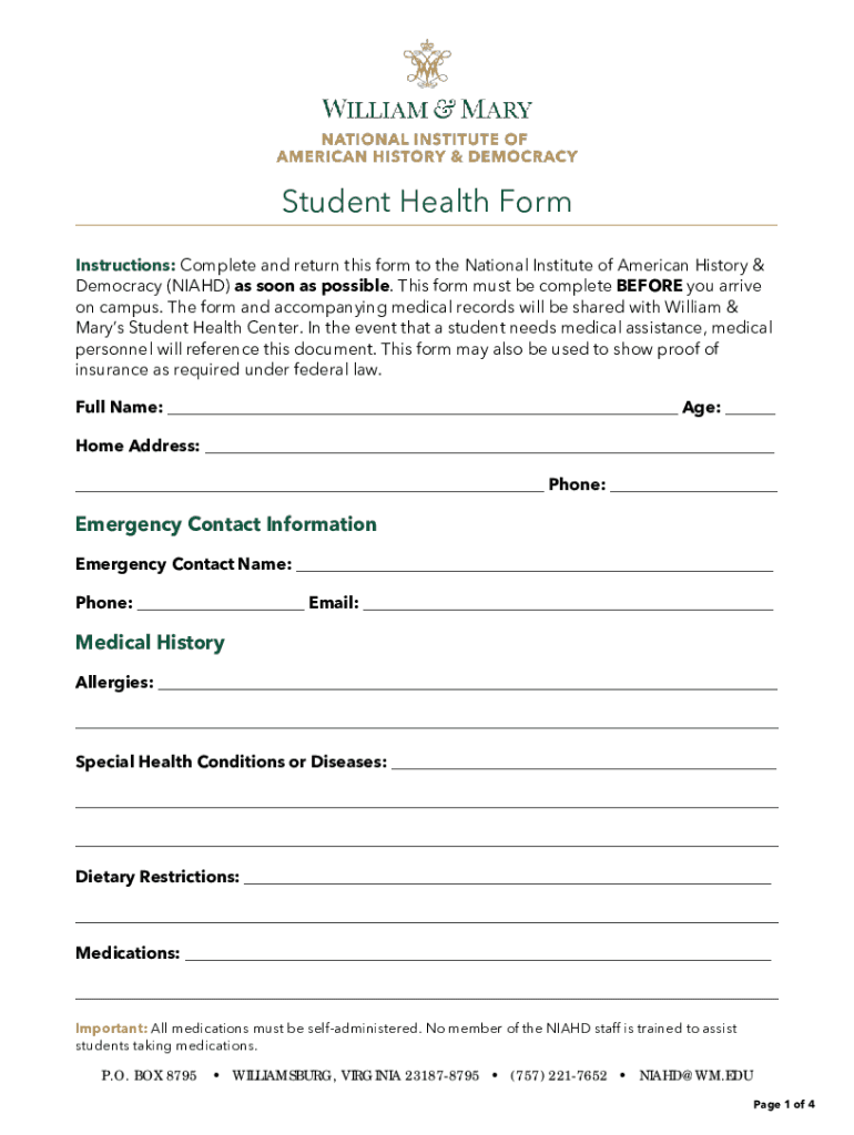 Get the free Student Health Form - William & Mary