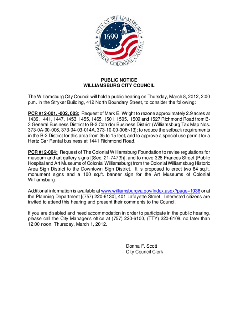 The Williamsburg City Council will hold a public hearing on Thursday, March 8, 2012, 2:00