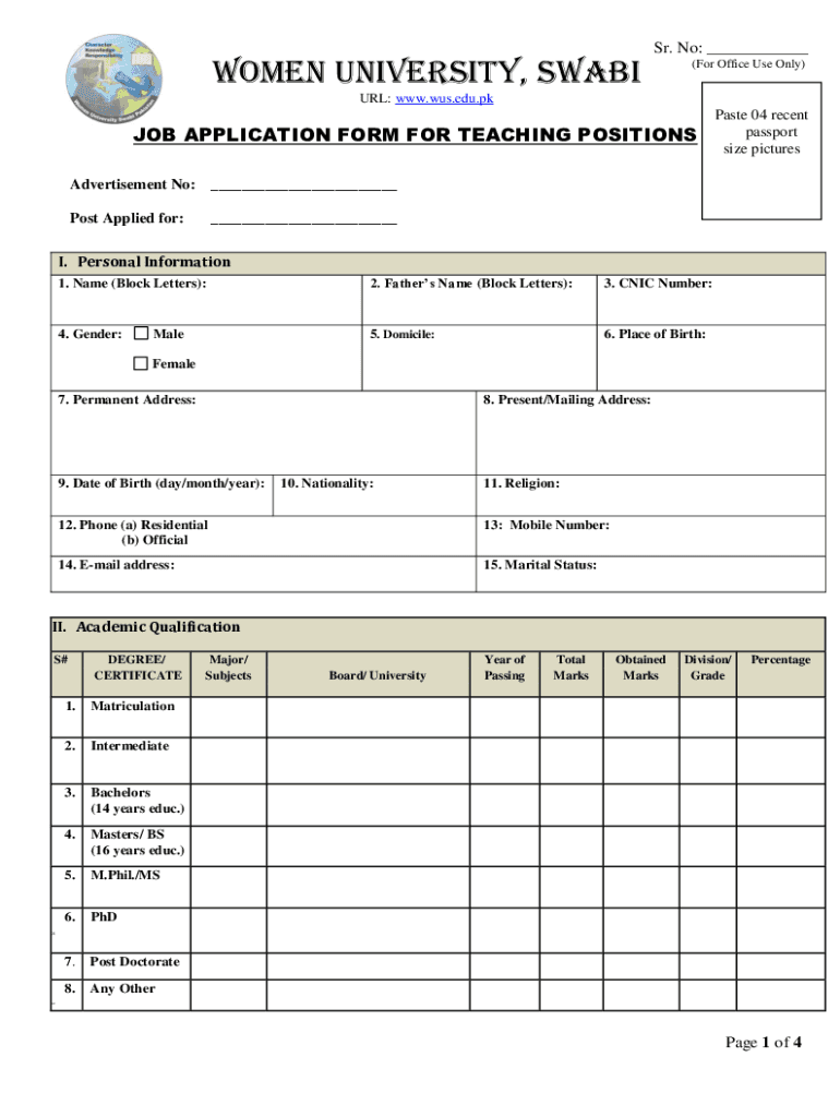 Women University, Swabs. No: (For Office Use Only)URL: www.wus.edu.pkJOB APPLICATION FORM FOR TEACHING POSITIONSPaste 04 recent passport size picturesAdvertisement No: Post Applied for: I. Personal