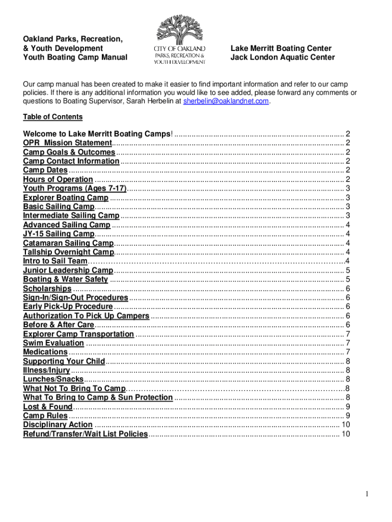 Oakland Parks, Recreation, & Youth Development Youth Boating Camp Manually Merritt Boating Center Jack London Aquatic Center camp manual has been created to make it easier to find important information