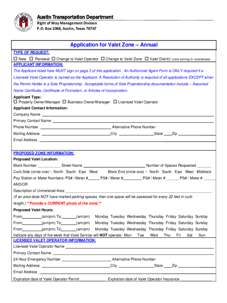 Austin Transportation Department Right of Way Management Division P.O. Box 1088, Austin, Texas 78767Application for Valet Zone Annual TYPE OF REQUEST: New Renewal Change to Valet Operator Change to
