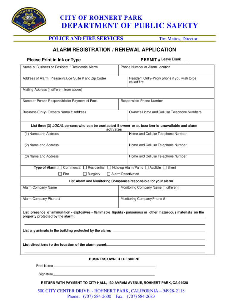 CITY OF ROBERT PARKDEPARTMENT OF PUBLIC SAFETY POLICE AND FIRE SERVICES Tim Mattes, Director ALARM REGISTRATION / RENEWAL APPLICATION Leave Blank PERMIT # Please Print in Ink or Type Name of Business