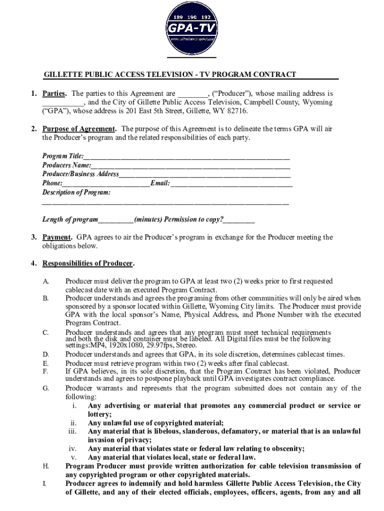 GILLETTE PUBLIC ACCESS TELEVISION TV PROGRAM CONTRACT 1. Parties. The parties to this Agreement are, (Producer), whose mailing address is, and the City of Gillette Public Access Television, Campbell