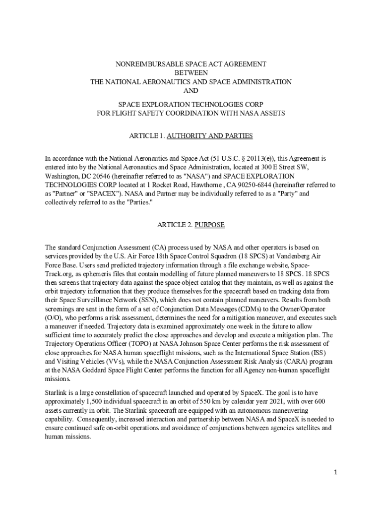 REIMBURSABLE SPACE ACT AGREEMENT BETWEEN THE NATIONAL AERONAUTICS AND SPACE ADMINISTRATION AND SPACE EXPLORATION TECHNOLOGIES CORP FOR FLIGHT SAFETY COORDINATION WITH NASA ASSETS ARTICLE 1. AUTHORITY