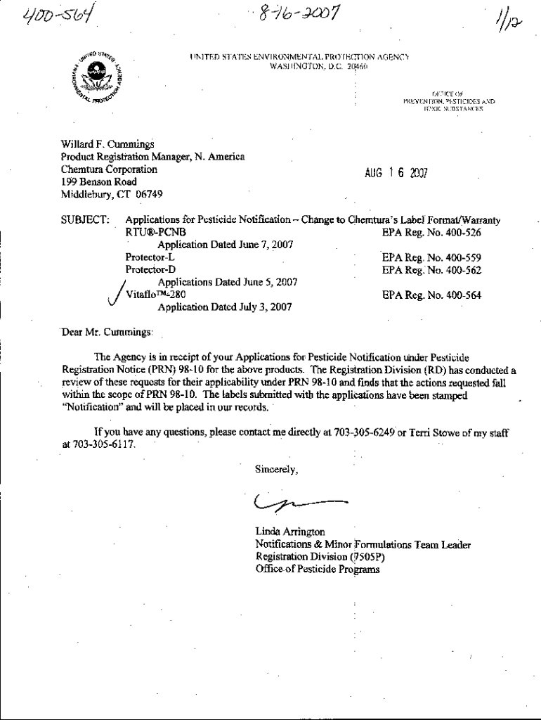 UNITED Sf DATES ENVIRONMENTAL PROTECTION AGENCY WASHINGTON, D.C. 2Q460OFF/CEO 'PREVENTION. PESTICIDES AND TOXIC SUBSTANCESWillardF. Cummings Product Registration Manager, N. America Century Corporation