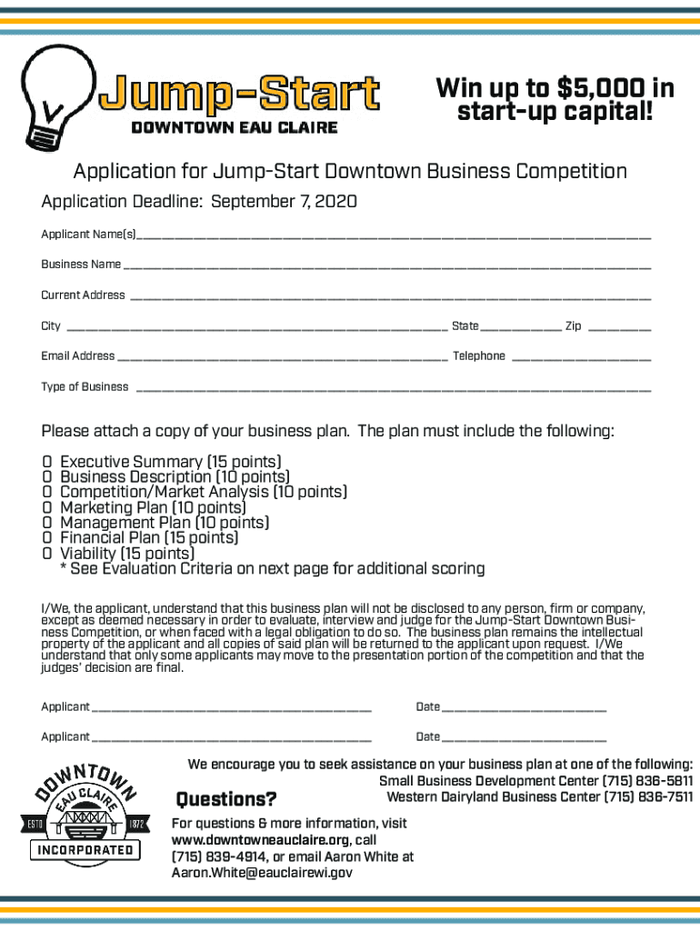 Win up to $5,000 in startup capital! Application for JumpStart Downtown Business Competition Application Deadline: September 7, 2020, Applicant Name(s) Business Name Current Address City State Zip