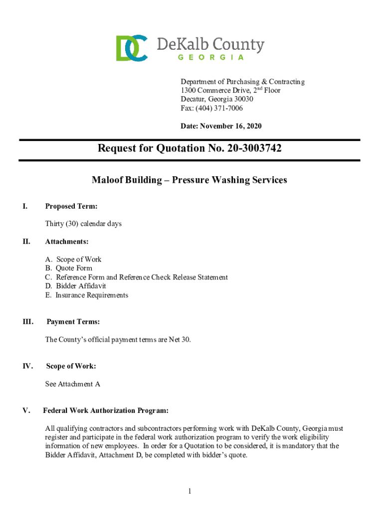 Department of Purchasing & Contracting 1300 Commerce Drive, 2nd Floor Decatur, Georgia 30030 Fax: (404) 3717006 Date: November 16, 2020Request for Quotation No. 203003742 Aloof Building Pressure Washing