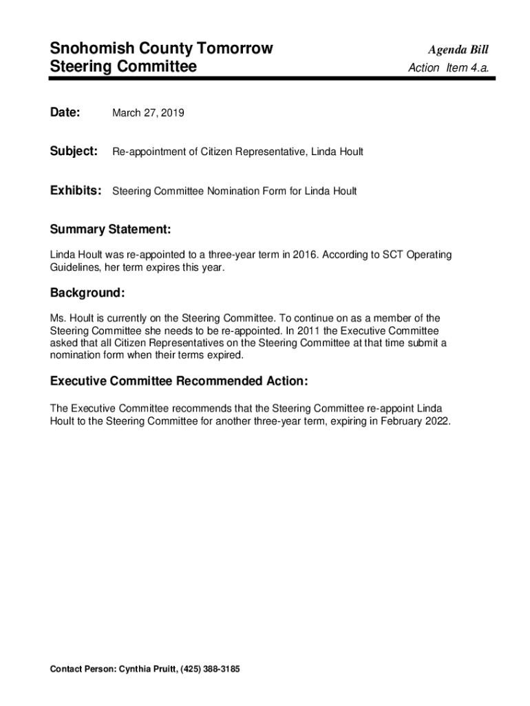 Date:March 27, 2019Subject:Reappointment of Citizen Representative, Linda HoultAgenda Bill