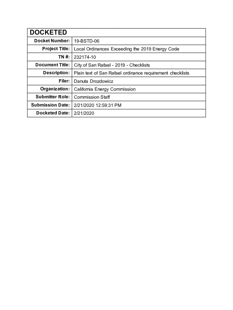 DOCKETED Docket Number: 19BSTD06 Project Title: Local Ordinances Exceeding the 2019 Energy Code TN #: 23217410 Document Title: City of San Rafael 2019 Checklists Description: Plain text of San Rafael