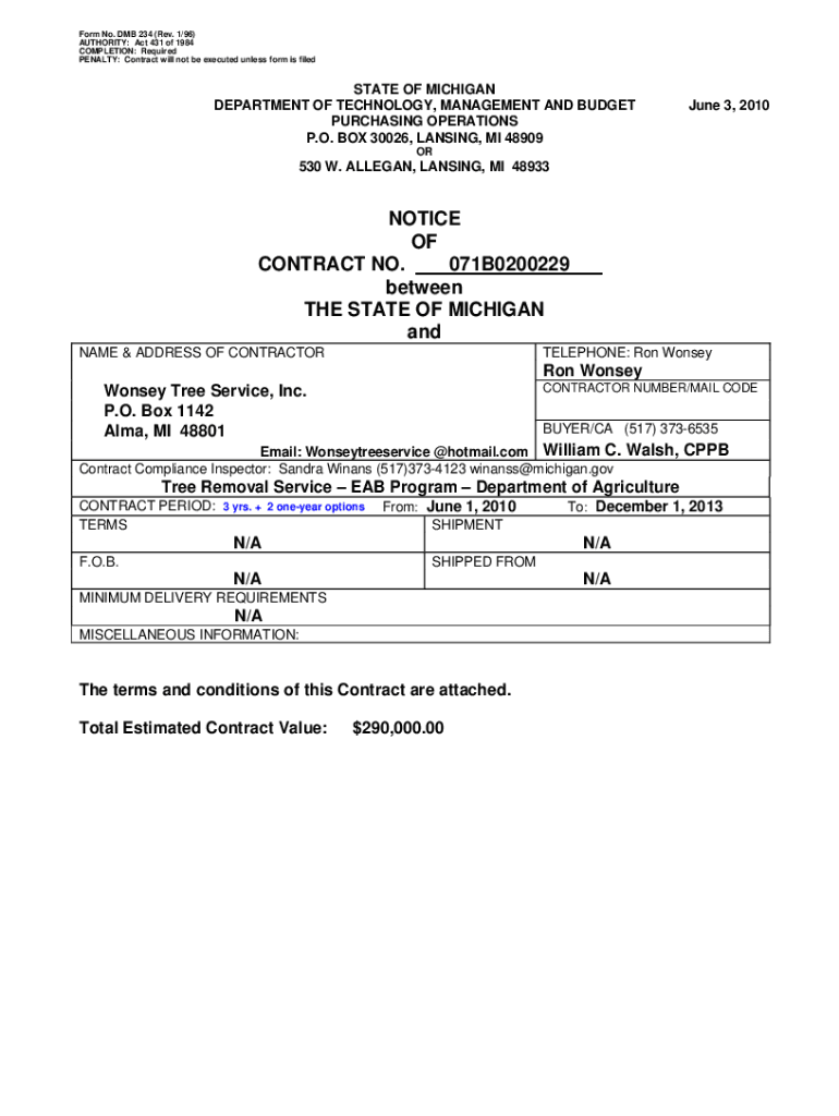 Form No. DUB 234 (Rev. 1/96) AUTHORITY: Act 431 of 1984 COMPLETION: Required PENALTY: Contract will not be executed unless form is fieldstone OF MICHIGAN DEPARTMENT OF TECHNOLOGY, MANAGEMENT AND BUDGET