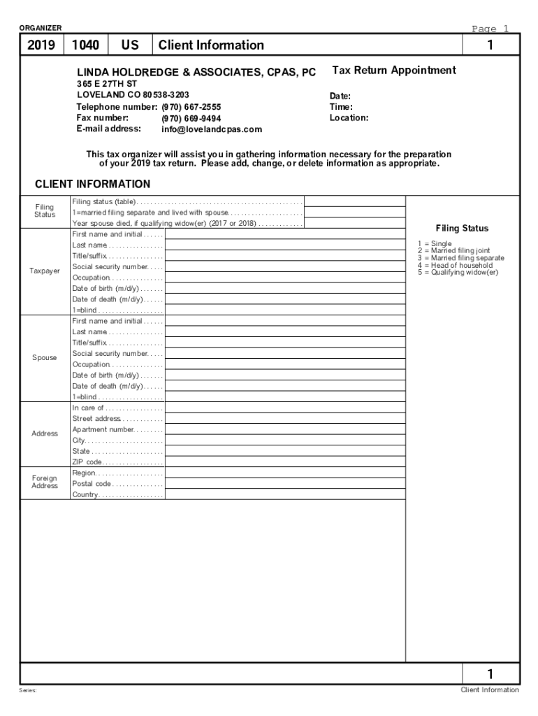 Page 1ORGANIZER20191040USClient InformationLINDA COLERIDGE & ASSOCIATES, CPA, PC 365 E 27TH ST LOVELAND CO 805383203 Telephone number: (970) 6672555 Fax number: (970) 6699494 Email address: info lovelandcpas.com1