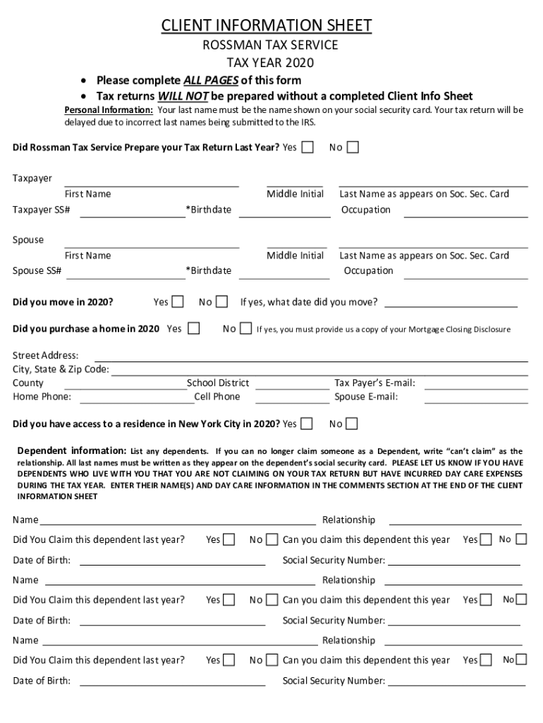 CLIENT INFORMATION SHEET GROSSMAN TAX SERVICE TAX YEAR 2020 Please complete ALL PAGES of this form Tax returns WILL NOT be prepared without a completed Client Info SheetPersonal Information: Your