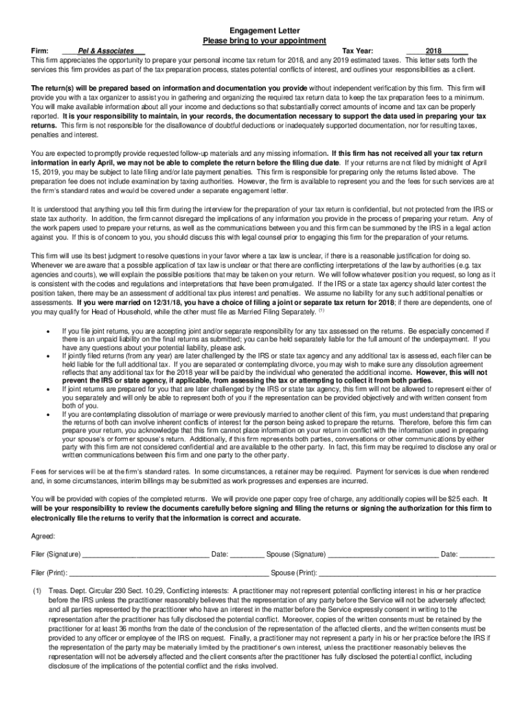Engagement Letter Please bring to your appointment Firm: PEL & Associates Tax Year: 2018 This firm appreciates the opportunity to prepare your personal income tax return for 2018, and any 2019 estimated