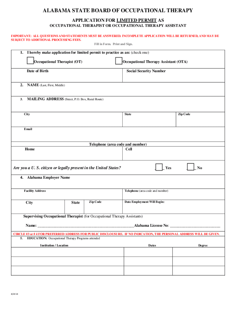 AS Alabama State Board of Occupational Therapy P.O. Box 3045103343534466Montgomery, AL 361304510INSTRUCTIONS APPLICATION FOR LIMITED PERMIT OCCUPATIONAL THERAPIST/OCCUPATIONAL THERAPY ASSISTANT This