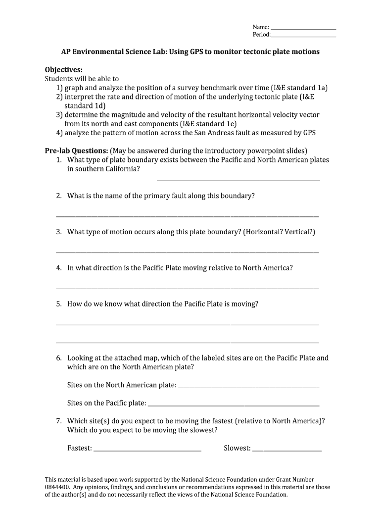 The AP Environmental Science Lab Worksheet is a lab worksheet template used by students to monitor tectonic plate motions using GPS data.
