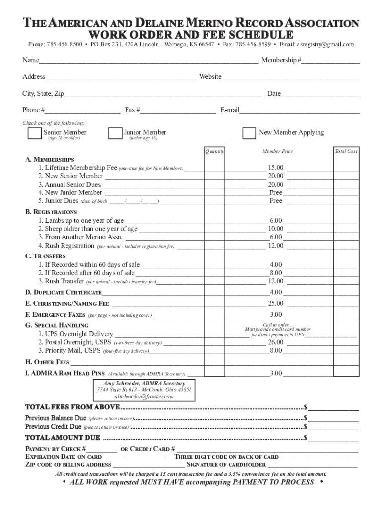 The American and Elaine Merino Record Association WORK ORDER AND FEE SCHEDULEPhone: 7854568500 PO Box 231, 420A Lincoln Cameo, KS 66547 Fax: 7854568599 Email: as registry Gmail. Compare Membership