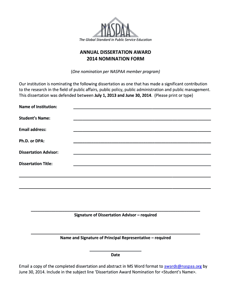 The Global Standard in Public Service Education ANNUAL DISSERTATION AWARD 2014 NOMINATION FORM (One nomination per NASA member program) Our institution is nominating the following dissertation as