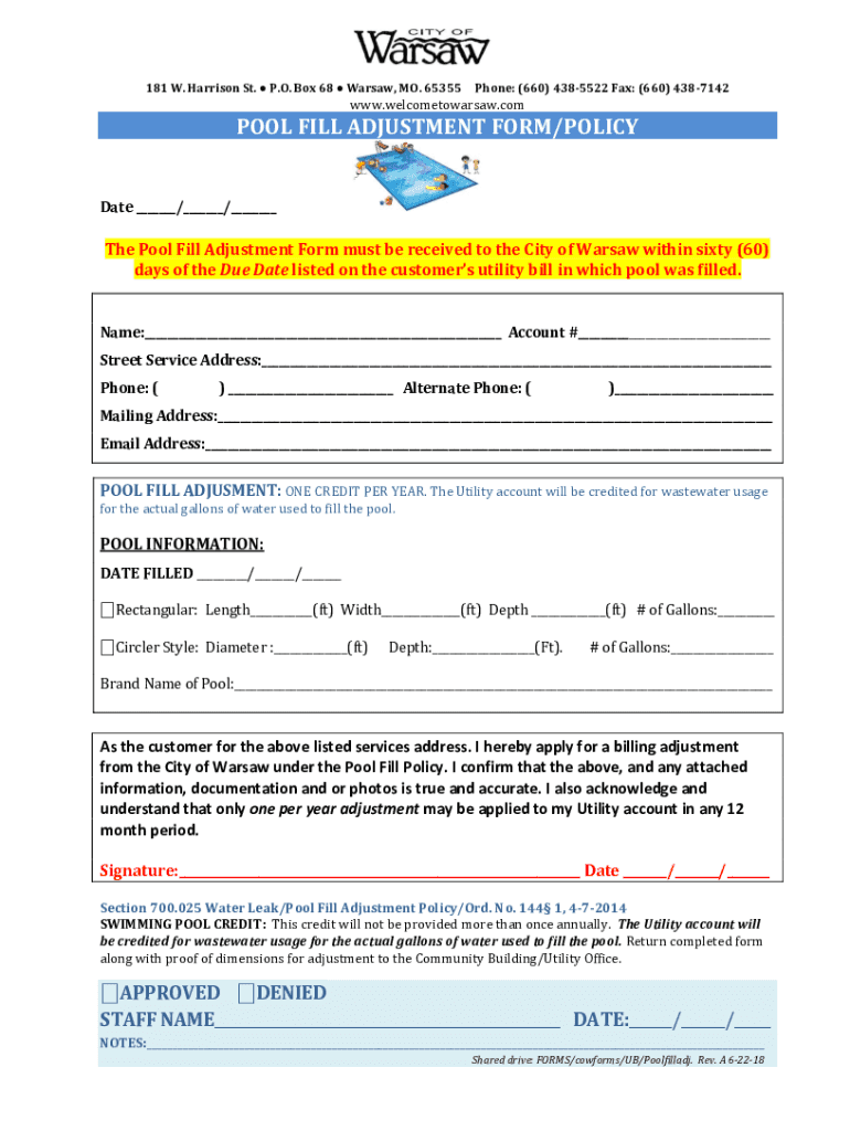 181 W. Harrison St. P.O. Box 68 Warsaw, MO. 65355Phone: (660) 4385522 Fax: (660) 4387142www.welcometowarsaw.compose FILL ADJUSTMENT FORM/Policymaker / / The Pool Fill Adjustment Form must be received