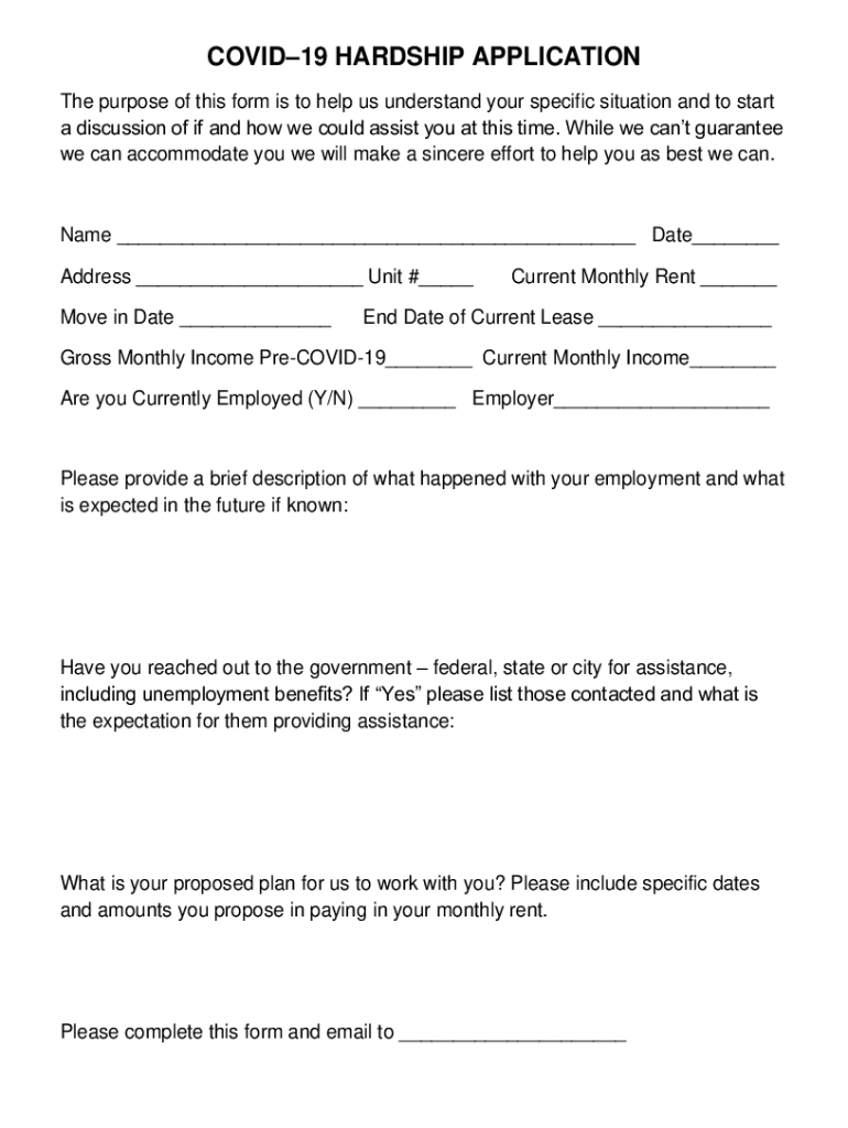 COVID-19 HARDSHIP APPLICATION The purpose of this form is to help us understand your specific situation and to start a discussion of if and how we could assist you at this time. While we can't guarantee