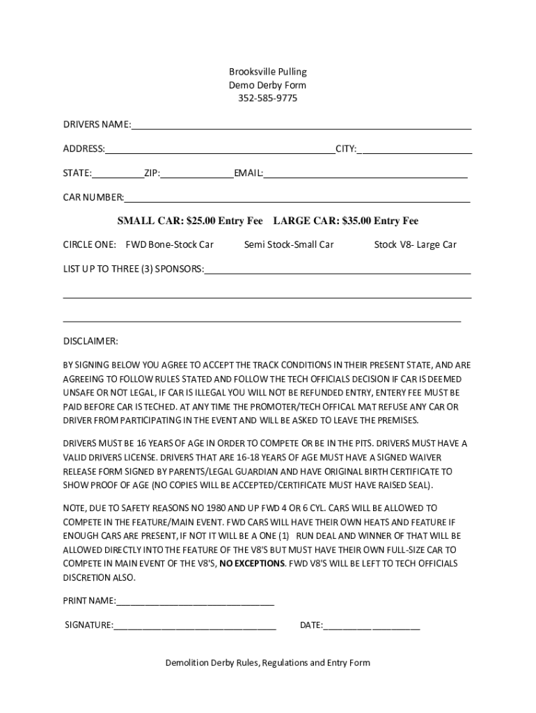 Brookville Pulling Demo Derby Form 3525859775 DRIVERS NAME: ADDRESS: CITY: STATE: ZIP: EMAIL: CAR NUMBER: SMALL CAR: $25.00 Entry Fee CIRCLE ONE: FWD Livestock Carnage CAR: $35.00 Entry Semi Stock