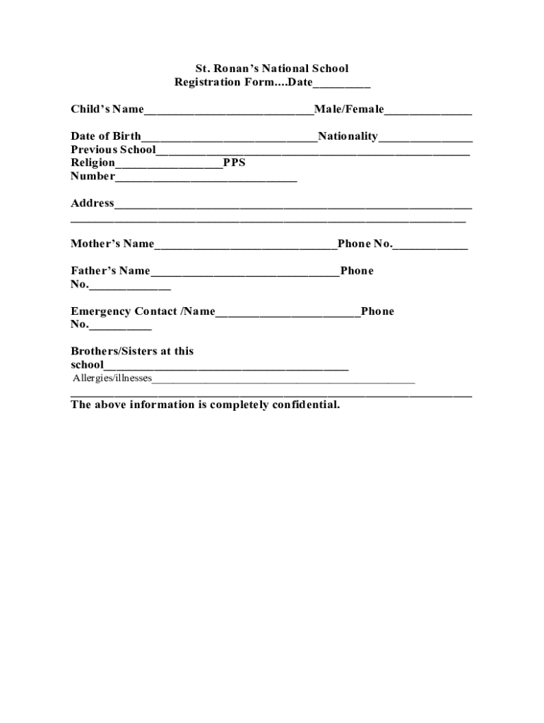 St. Romans National School Registration Form.... Date Child's Name Male/Female Date of Birth Nationality Previous School Religion PPS Number Address Mothers Name Phone No. Fathers Name Phone No. Emergency