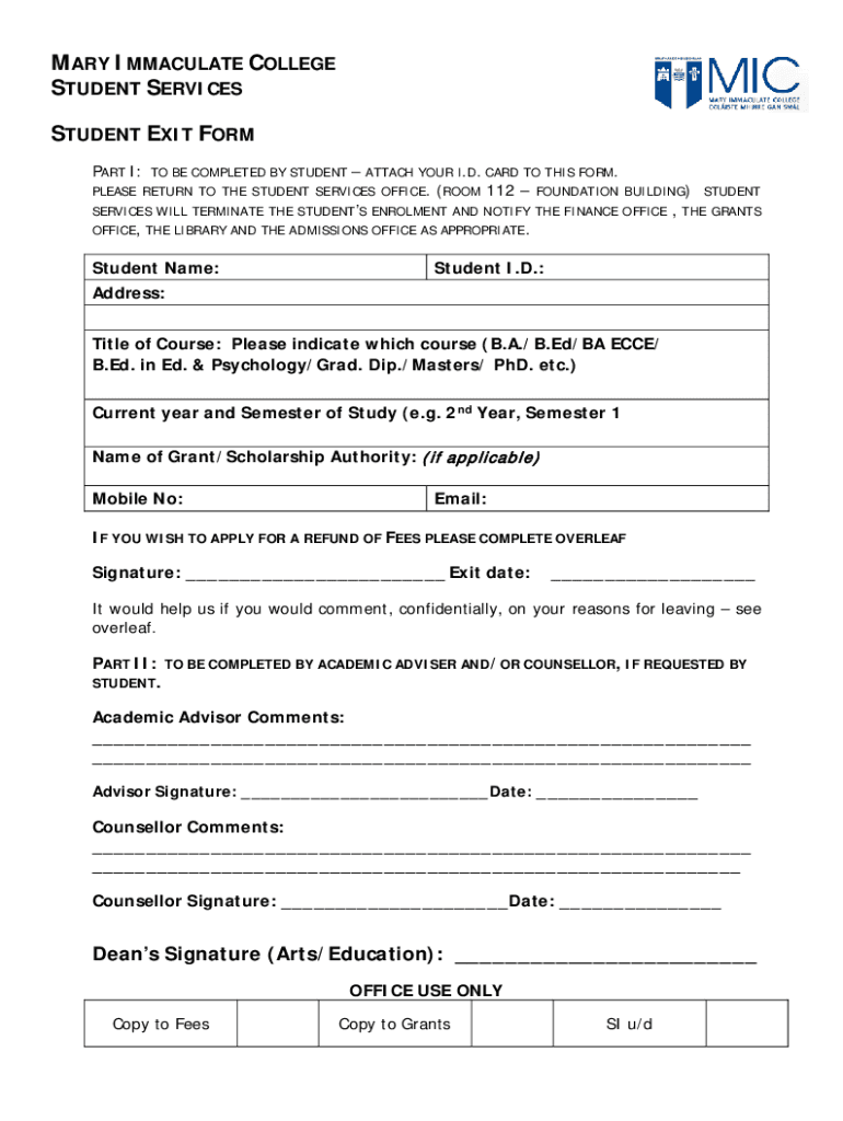MARY IMMACULATE COLLEGE STUDENT SERVICES STUDENT EXIT FORM PART I: ATTACH YOUR I.D. CARD TO THIS FORM. 112 FOUNDATION BUILDING) STUDENT SERVICES WILL TERMINATE THE STUDENTS Enrollment AND NOTIFY THE