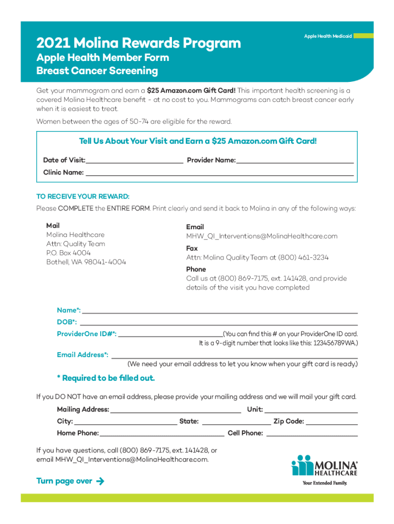Apple Health Medicaid2021 Molina Rewards Program Apple Health Member Form Breast Cancer Screening your mammogram and earn a $25 Amazon.com Gift Card! This important health screening is a covered Molina